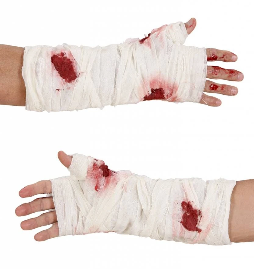 Dit is een bloederig armverband dat je om je arm kunt winden om het zo te laten lijken alsof je een ernstige armwond of armbreuk hebt. Er zijn meer nep verbanden met bloed die je voor het namaken van allerlei wonden kunt gebruiken.