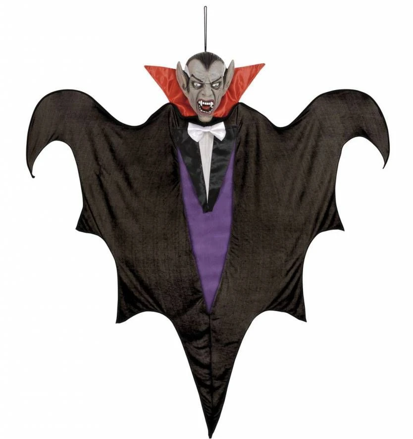 Deze hangende vampier pop van 140 cm grootte is een ware horror decoratie die zo uit een spookhuis ontsnapt kon zijn. Deze vampier heeft ook nog eens heel veel vriendjes zoals hangende heksen, hangende geest poppen en skeletten, zodat jouw Halloween feestruimte helemaal in de sfeer van dood en verderf zal komen. Daag ze niet uit, sommige maken geluid of gaan je met venijnig oplichtende ogen aankijken.