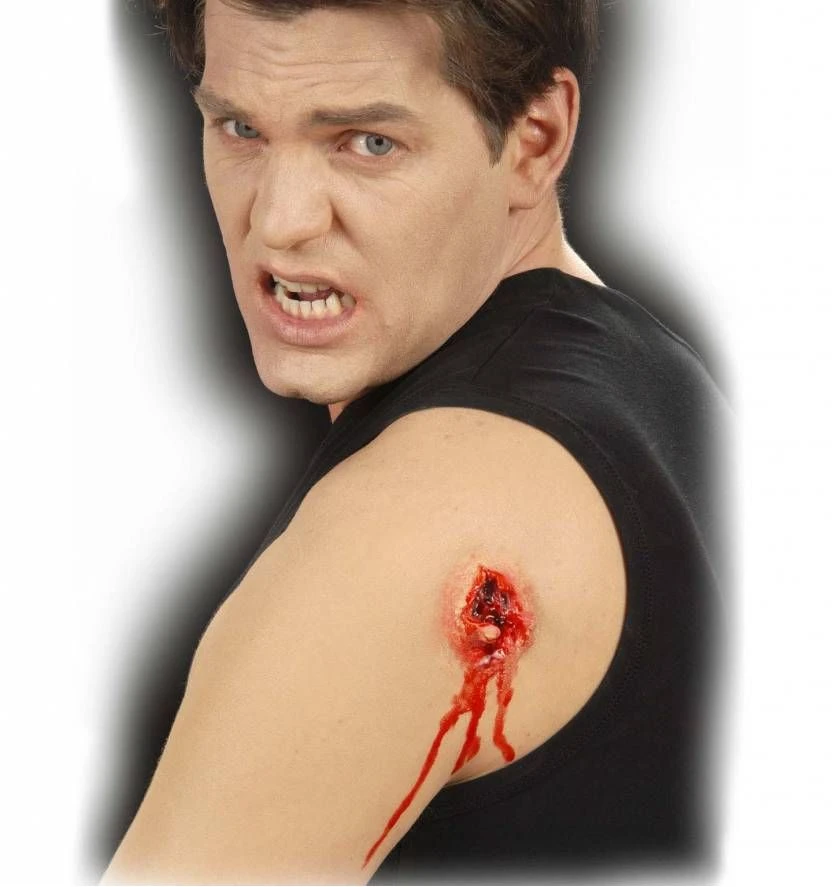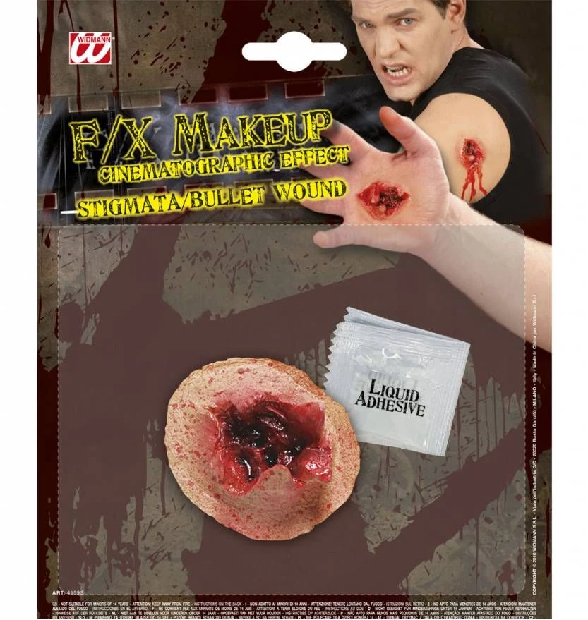 Dit zijn twee nep uitgaande kogelwonden voor op je huid voor Halloween waardoor het lijkt als of je vreselijk gewond bent. Deze nep wonden met lijm maken deel uit van een grote collectie grimeer spullen voor Halloween. In deze wonden collectie tref je allerlei nep wonden en nep kogelgaten aan om je Halloween look zo luguber mogelijk te maken.